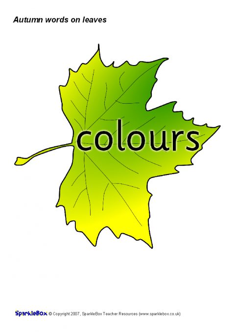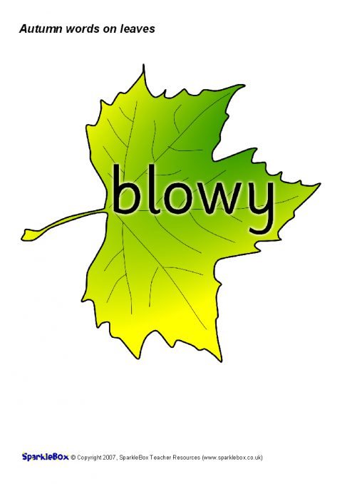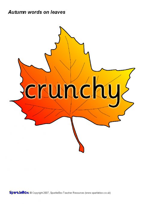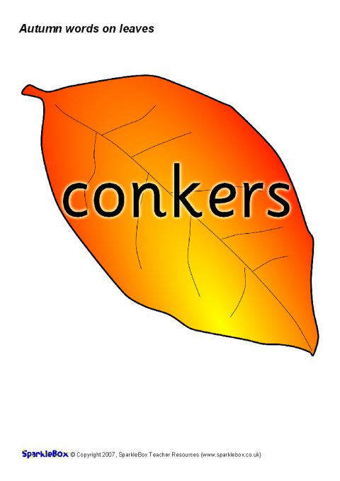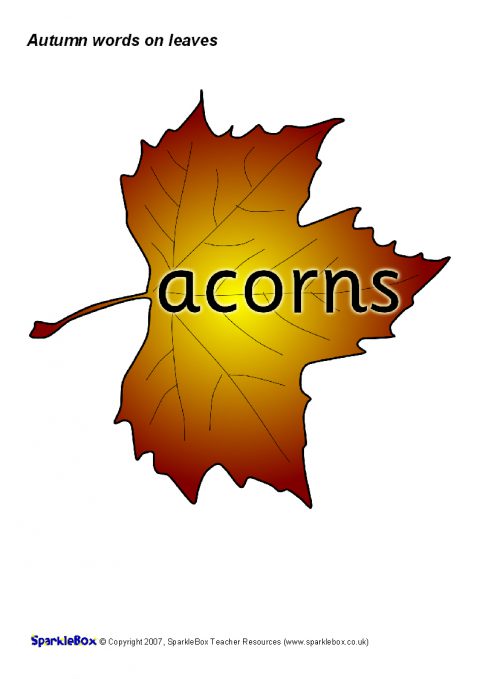 A set of Autumn season words presented on Autumn-coloured leaves.