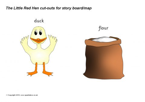 A set of printable cut-out character pictures for use when retelling the story of The Little Red Hen. These are ideal for laminating and using on story boards or story mats to encourage oral retelling of the story. Also includes pictures of the bread loaf, flour, wheat and grain and some simple story text.