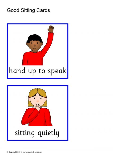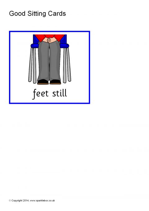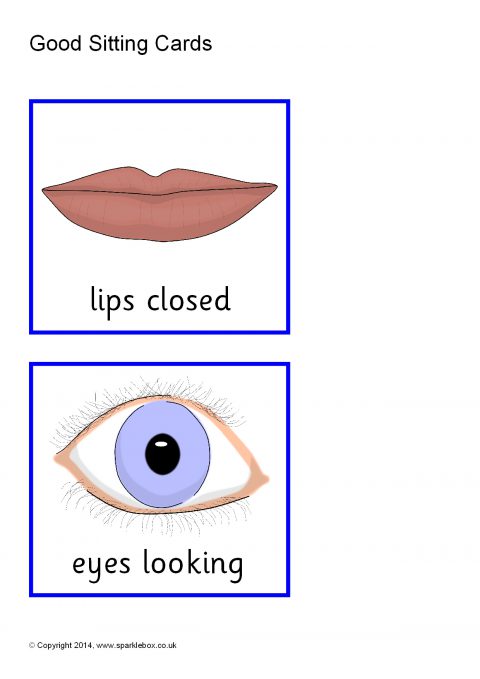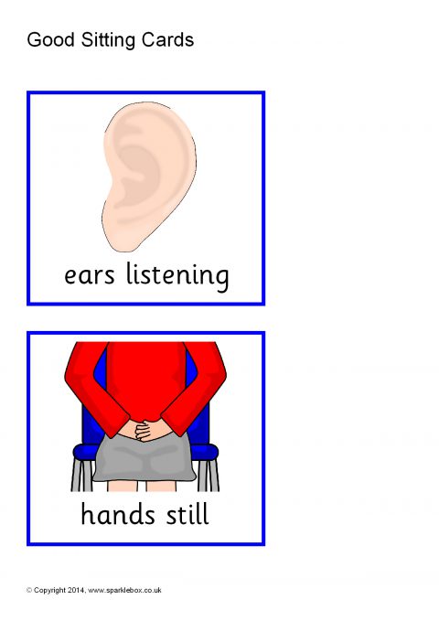A group of 7 simple cards showing important skills that promote ‘good sitting'.