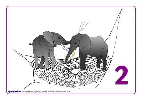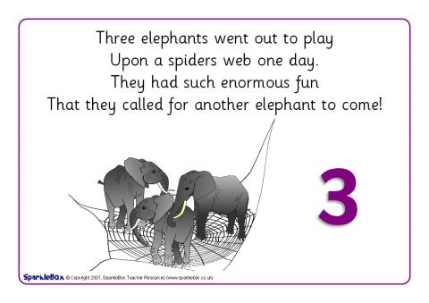 A set of A4 visual aids to accompany the number-rhyme ‘One elephant went out to play’.