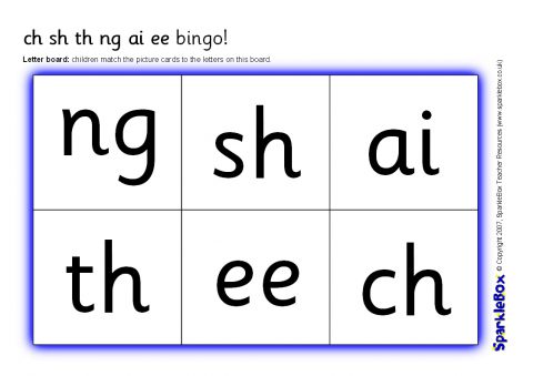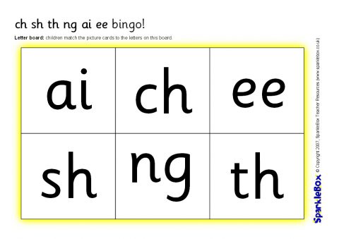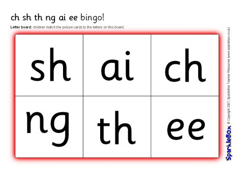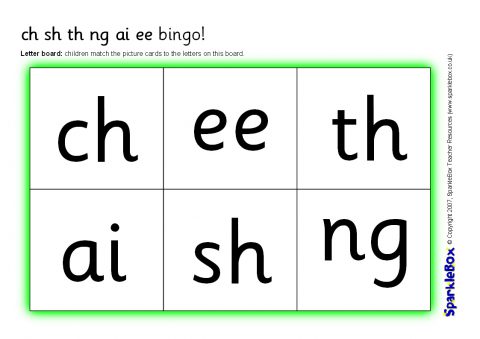 A set of printable bingo boards and cards using the phonemes ch, sh, th, ng, ai and ee. The set consists of 4 different phoneme boards and 4 different picture boards as well as picture letter cards. The game can be played by matching pictures to letters, or letters to pictures.
