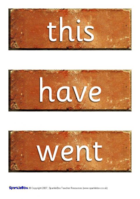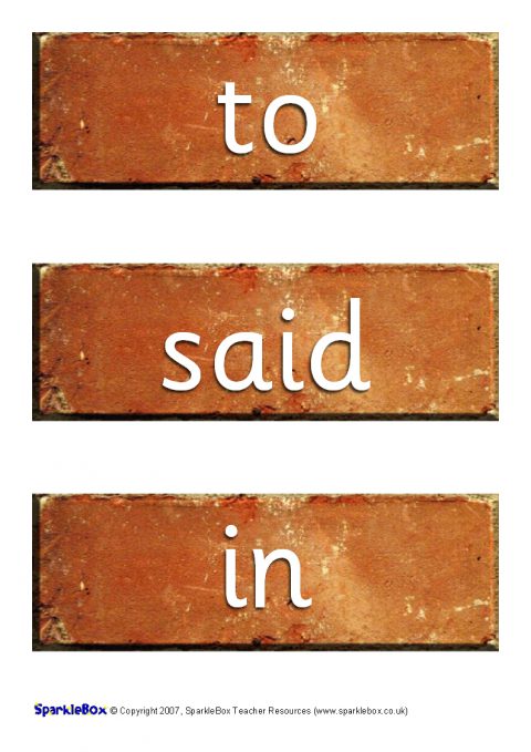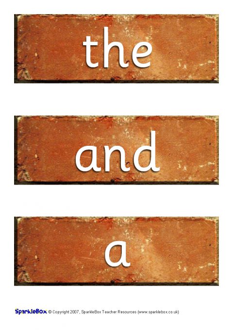 The 100 high-frequency words as specified in the DfES ‘Letters and Sounds’ publication presented on authentic-looking bricks for your classroom Word Wall.  Print them out and add a new brick to the wall as you introduce the keywords to your class!