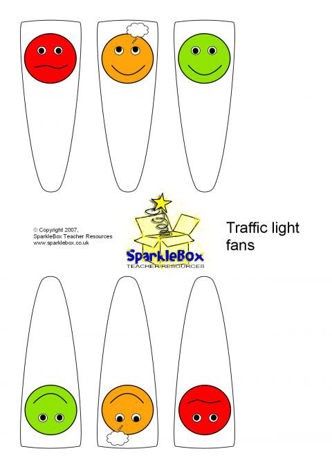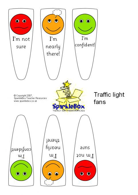 A set of printable fans with red, amber and green faces for ‘I’m not sure’, ‘I’m nearly there’ and ‘I’m confident!’.