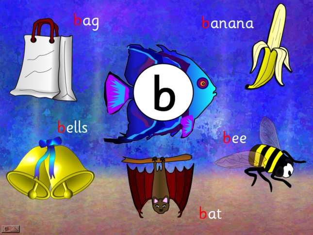 A teacher-controlled presentation for use with the whole-class or smaller groups.  As the mouse is clicked, objects beginning with ‘b’ appear along with the accompanying words.