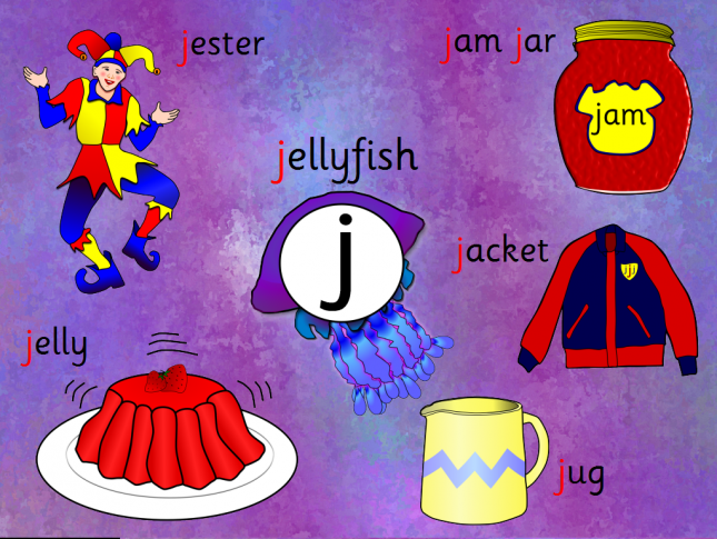 A teacher-controlled presentation for use with the whole-class or smaller groups.  As the mouse is clicked, objects beginning with ‘j’ appear along with the accompanying words.