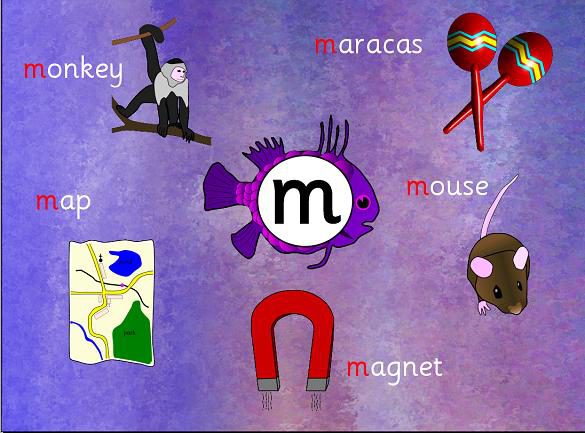 A teacher-controlled presentation for use with the whole-class or smaller groups.  As the mouse is clicked, objects beginning with ‘m’ appear along with the accompanying words.