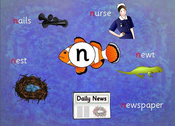 A teacher-controlled presentation for use with the whole-class or smaller groups.  As the mouse is clicked, objects beginning with ‘n’ appear along with the accompanying words.