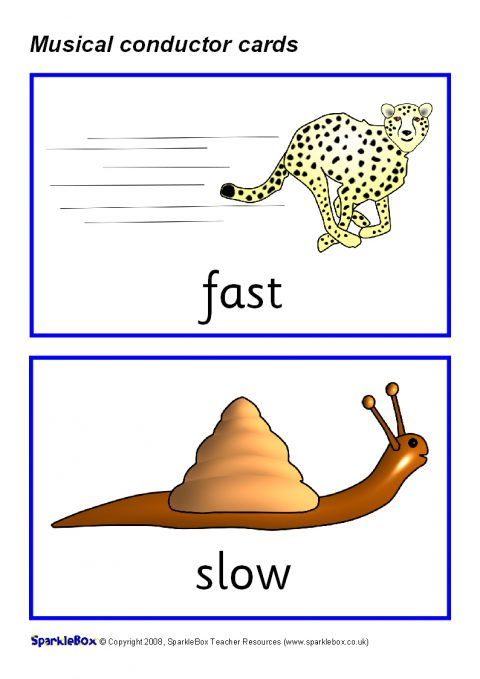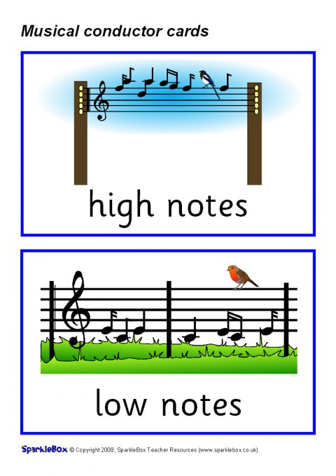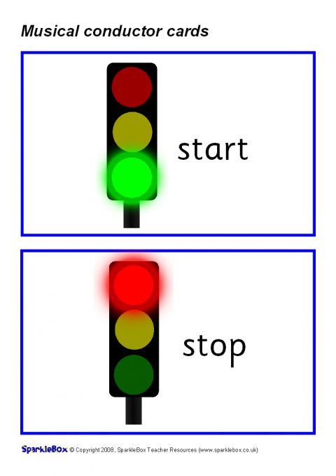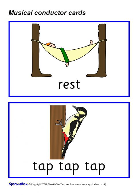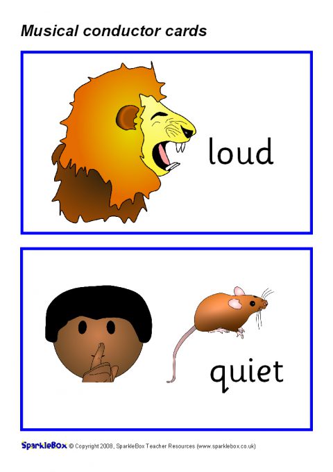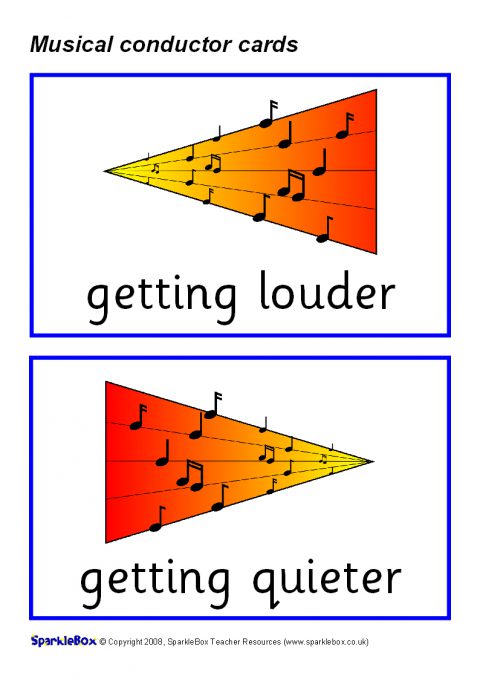 A set of cards with visual prompts and words for the ‘conductor’ to hold up and instruct the musicians on how to play the music.