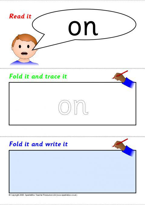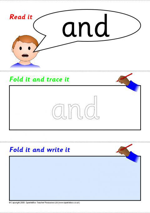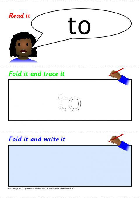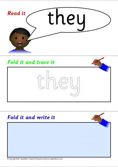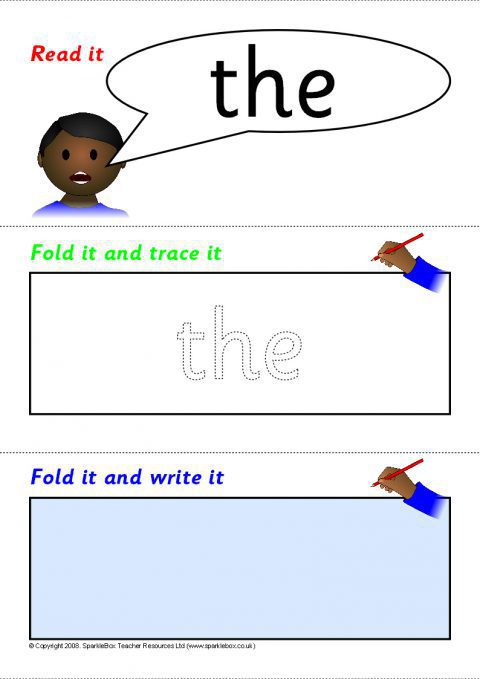 A set of fold-over A4 sheets featuring 100 high-frequency words.  The pupil reads the word then folds back, then traces the word and folds back and then writes the word from memory.