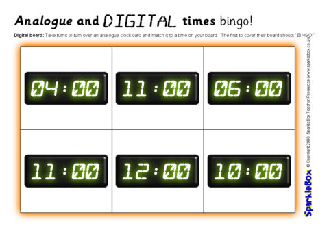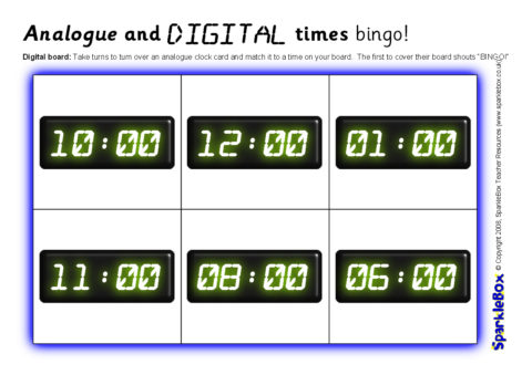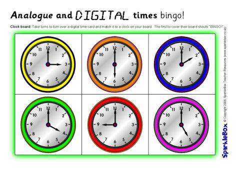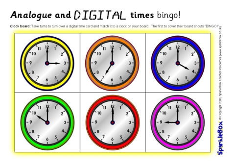 A printable bingo set which includes analogue clock boards and digital clock boards. Laminate the boards for extra durability. A simple but fun activity where children match the the digital clock cards to the analogue clocks on their board (or vice versa).