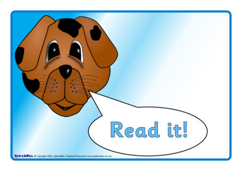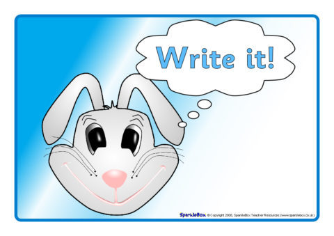 Simple printable posters featuring pet characters expressing the spelling/writing reminders: think it, say it, write it and read it.