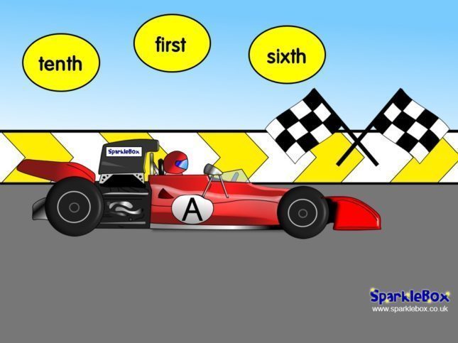 An interactive PowerPoint show where children are presented with race cars as they finish the race. As each car appears they click on the appropriate ordinal number word that shows their position in the race.