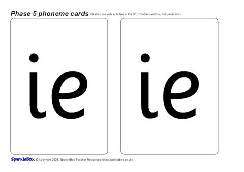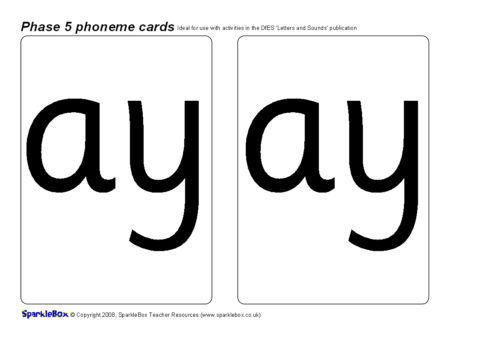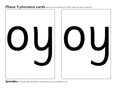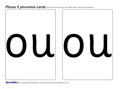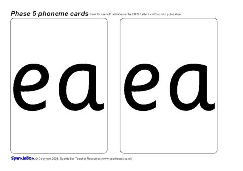 A set of large printable cards (2 per A4 sheet) featuring all of the 19 additional Phase 5 phonemes as listed in the DfES ‘Letters and Sounds’ publication.