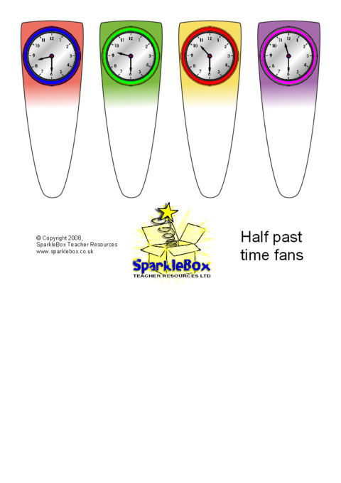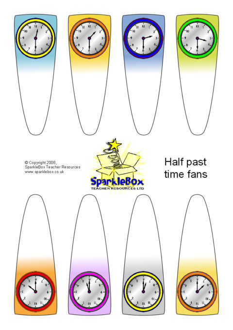 A printable set of fan segments featuring half past analogue clock times. Print on card, laminate, and assemble into pupil fans with a split pin.