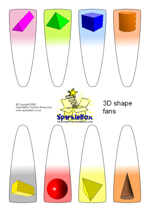 A printable set of fan segments featuring 3D shapes. Print on card, laminate, and assemble into pupil fans with a split pin.