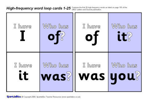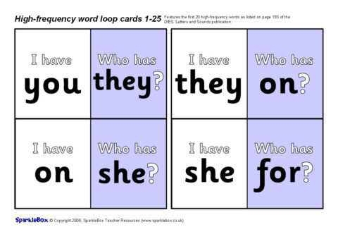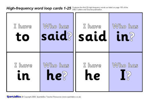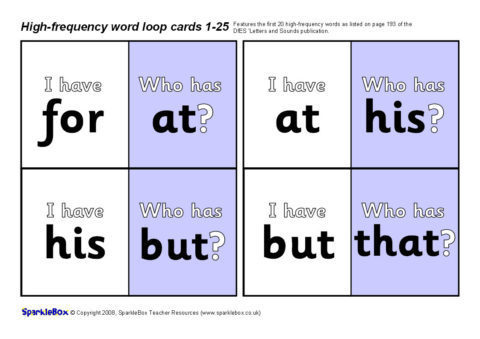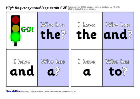 A set of printable loop cards featuring the first 25 high-frequency words as specified in the DfES ‘Letters and Sounds’ publication.