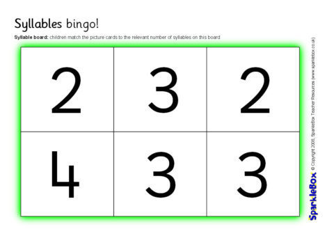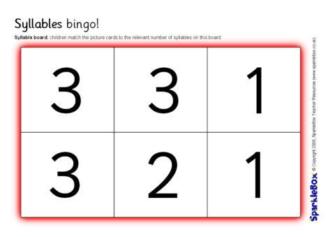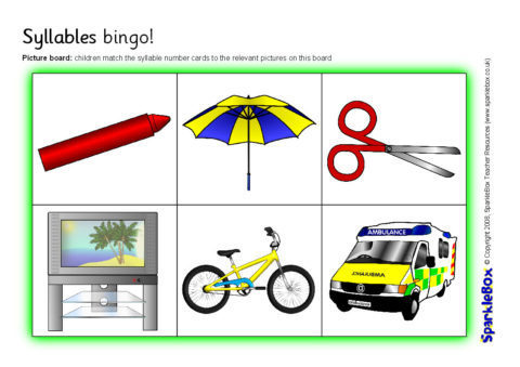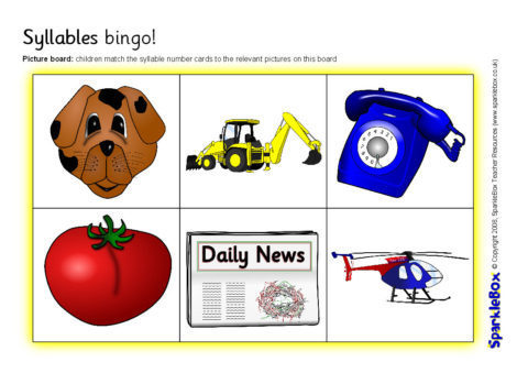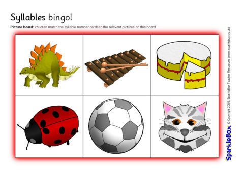 A set of printable bingo boards and cards for counting syllables in words.  Children can match the numbers to the pictures or vice versa.