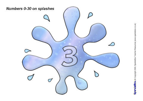 A set of A4-sized printable water splashes featuring the numbers from 0 up to 30. These are ideal for creating wall displays or hanging number lines in your classroom. Can also be used as fun flash cards and all sorts of other uses. Print size can be reduced using ‘print scale’ option in Adobe Reader.