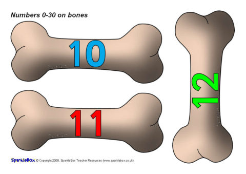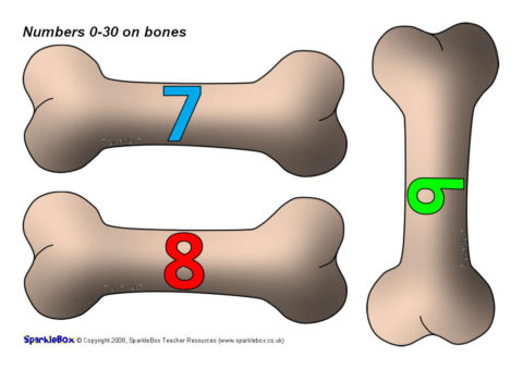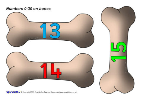 The numbers from 0-30 presented on bones.  Great for use in your sand or digging area linked to a topic on dinosaurs or the ‘Funnybones’ books.