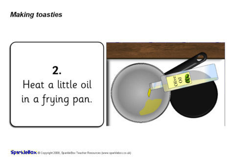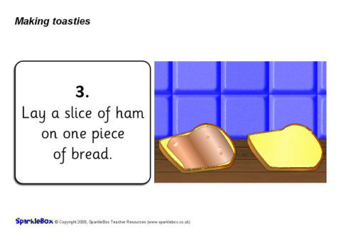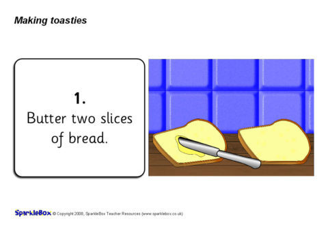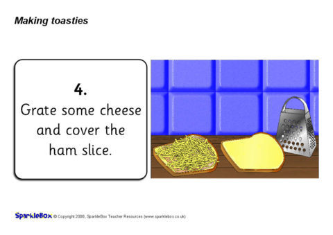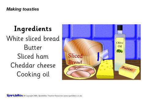 A useful set of simple visual aids showing how to make toasties in 8 steps.  It includes instructional text and a list of ingredients.  Also perfect for use in a classroom display.