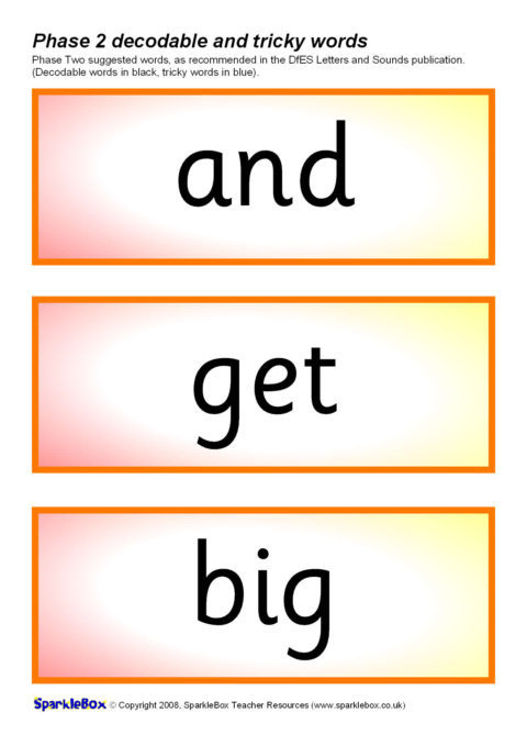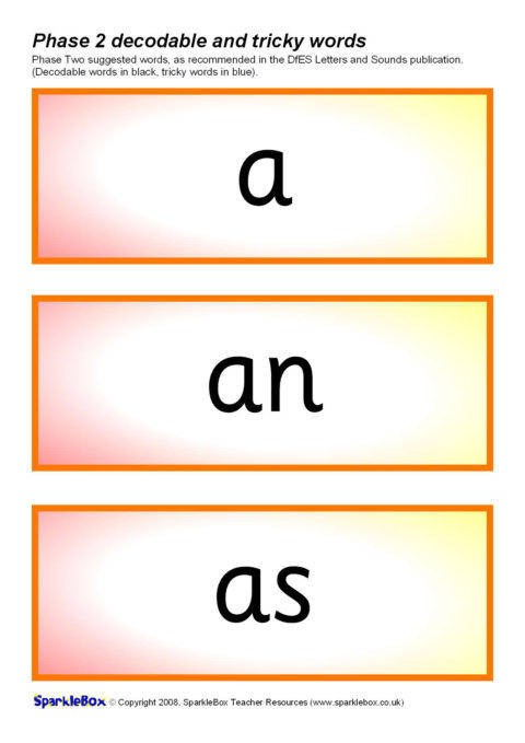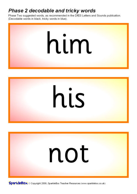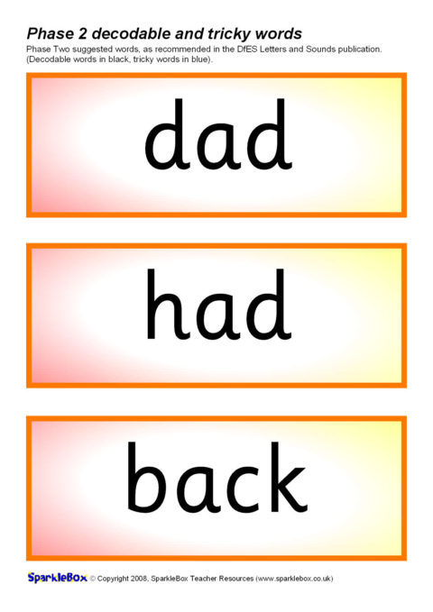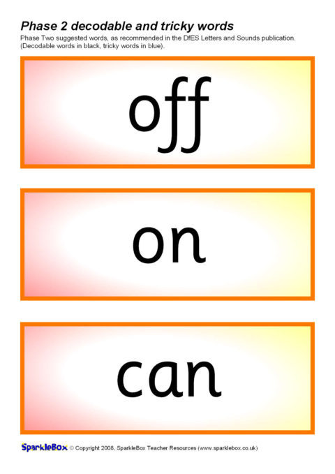 The decodable and tricky words for Phase Two as specified in the DfES Letters and Sounds publication.