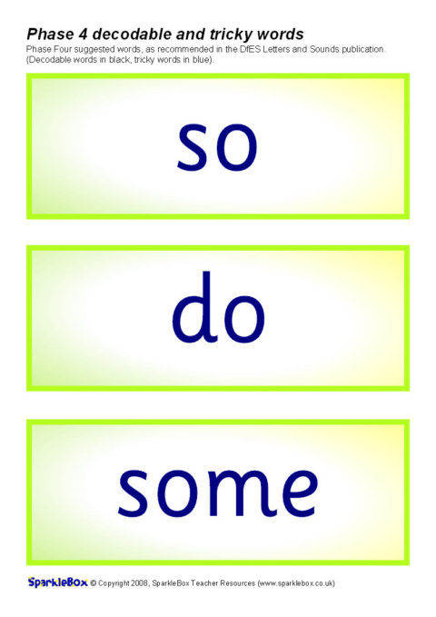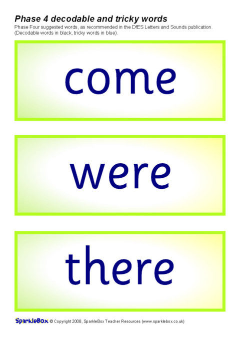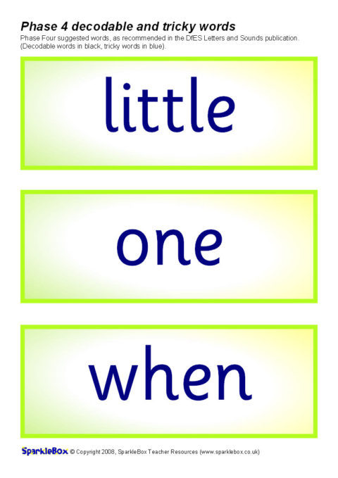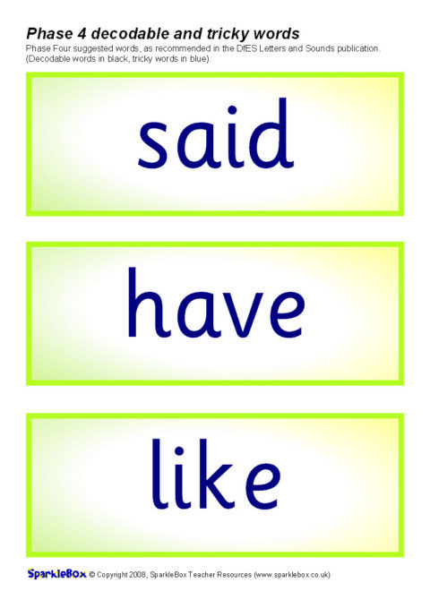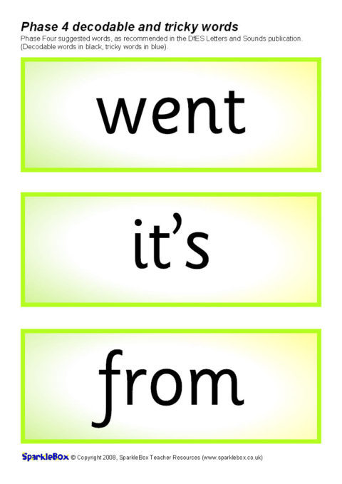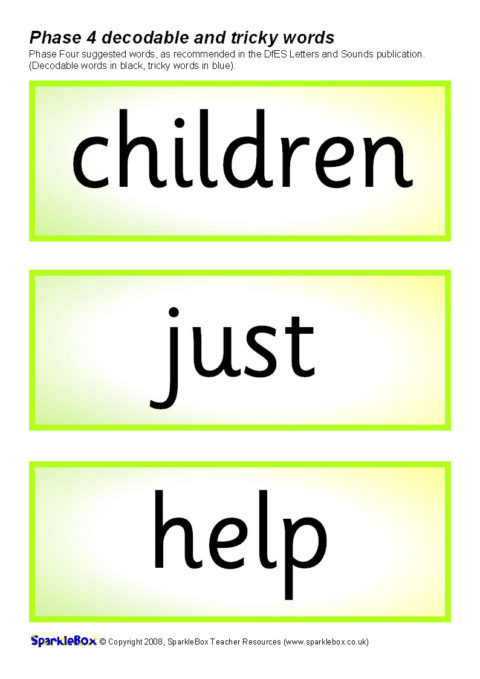 The decodable and tricky words for Phase Four as specified in the DfES Letters and Sounds publication.