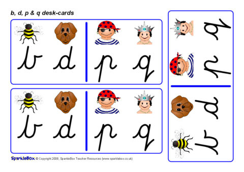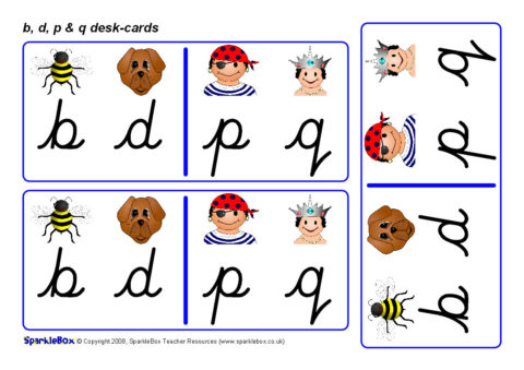 Some simple printable cards to sit on pupils’ desks as reminders of how to form b, d, p and q.  Includes cursive script versions.