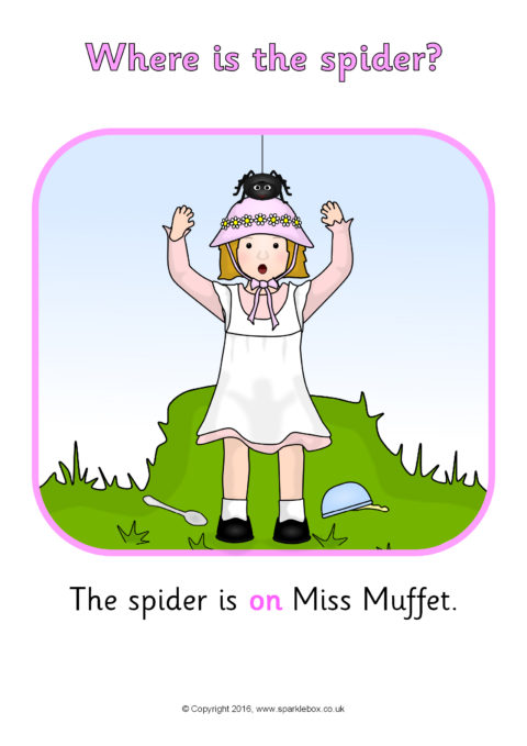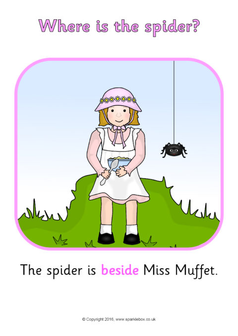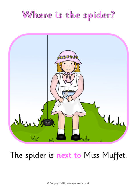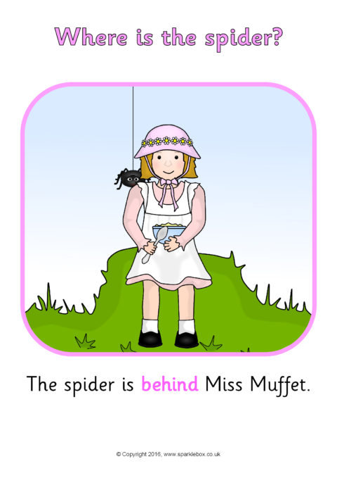 A set of fun visual aids where children can be asked the position of the spider in relation to Little Miss Muffet.