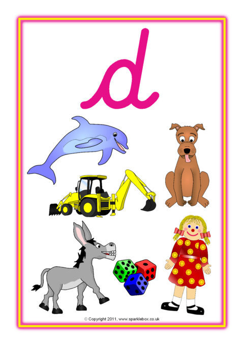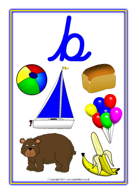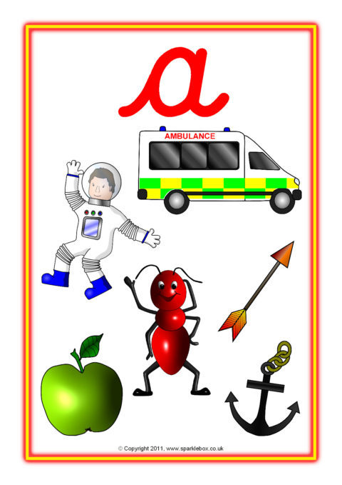 A set of A4-sized posters featuring the letters of the alphabet in cursive script, together with images of items that begin with each alphabet sound.  These would make a colourful alphabet line if displayed in your classroom or could be used to aid discussion about each initial sound.