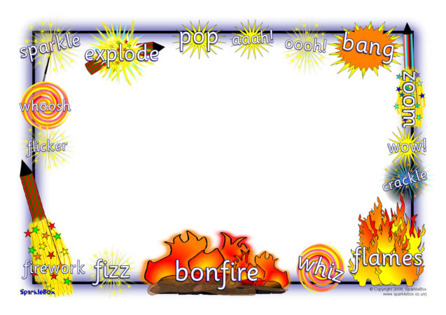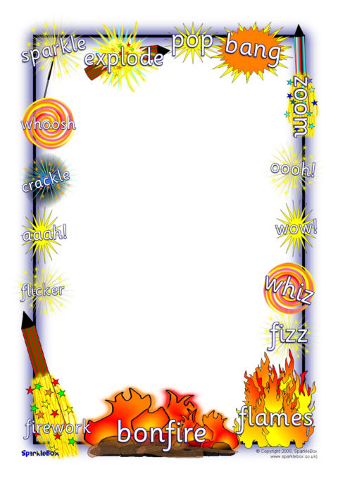 Printable A4 page borders with firework pictures and words (portrait and landscape).  Includes PDFs and editable versions for Microsoft Word.