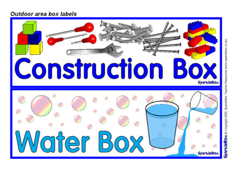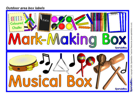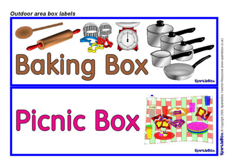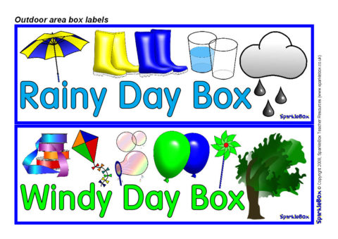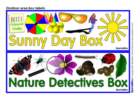 A group of printable labels for your outdoor area resource boxes, such as ‘Rainy Day Box, ‘Windy Day Box’, ‘Mark-Making Box’ and ‘Nature Detectives Box’.