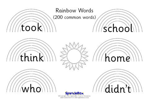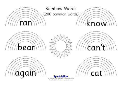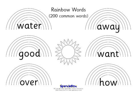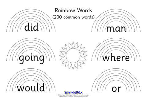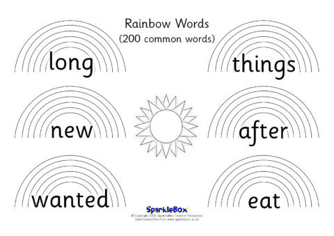 The next 200 common words as specified in the DfES ‘Letters and Sounds’ publication, presented with black and white rainbows, 6 to a page.  Ideal as record sheets where children can colour the rainbows as they learn the words.