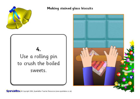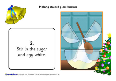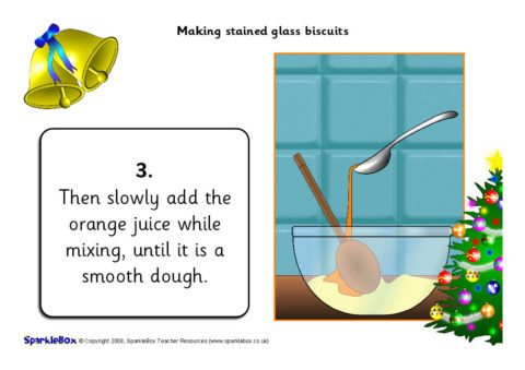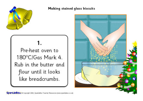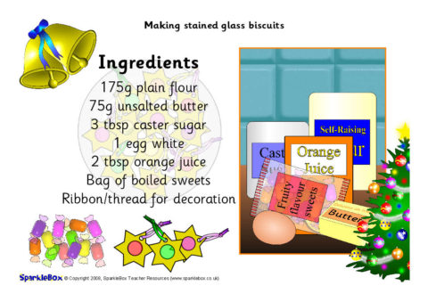 A useful set of simple visual aids showing how to make ‘stained glass’ biscuits.  It includes instructional text and a list of ingredients.  Also perfect for use in a classroom display.