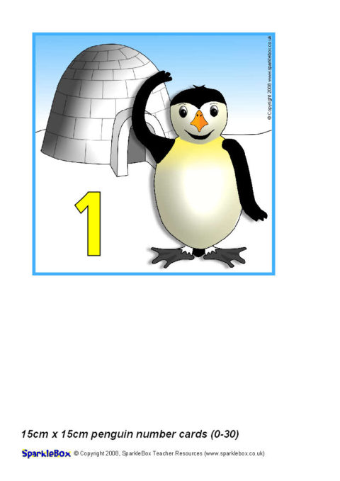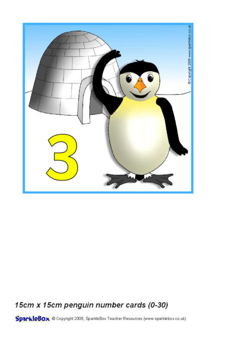Multi-use printable cards featuring penguins a fun penguin character with the numbers from 0 to 30. Each card is 15cm by 15cm and can be used for all sorts of card-based activities.