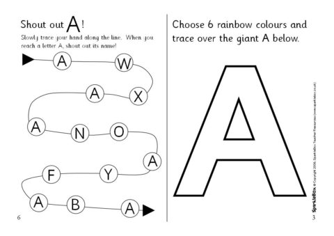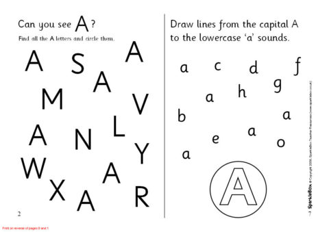 A set of sheets which can be assembled into an A5 folded booklet to give to pupils. It includes activities to aid recognition of the capital letter 'A'. Ideal as a homework resource.