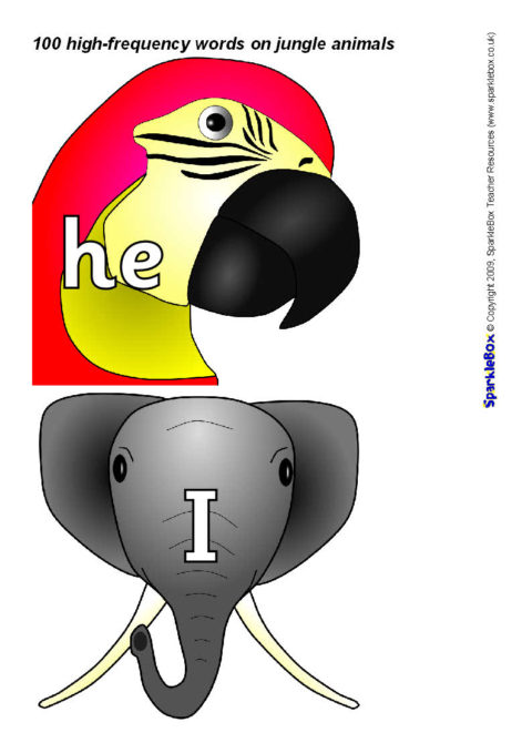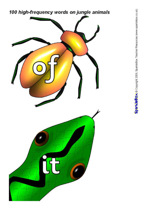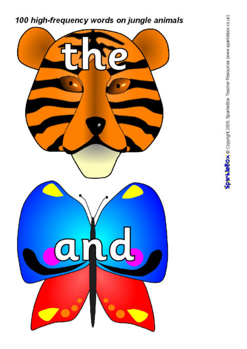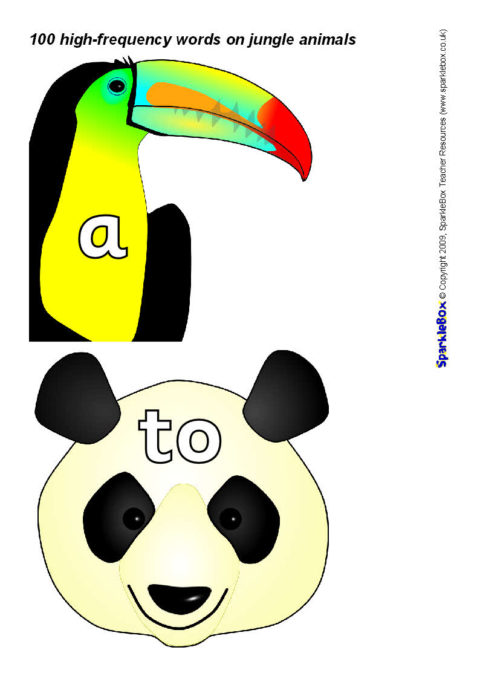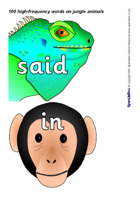The 100 high-frequency words as specified in the DfES ‘Letters and Sounds’ publication presented on colourful jungle animal characters.