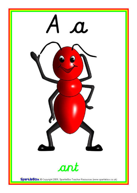 A set of fun A4-sized alphabet posters showing cartoon characters for each letter. Includes ant, cow, frog, kite, ladybird, pirate, worm and loads more colourful pictures! They can easily be resized to print multiple pages per sheet using Adobe Reader. This makes them perfect as flash cards as well.