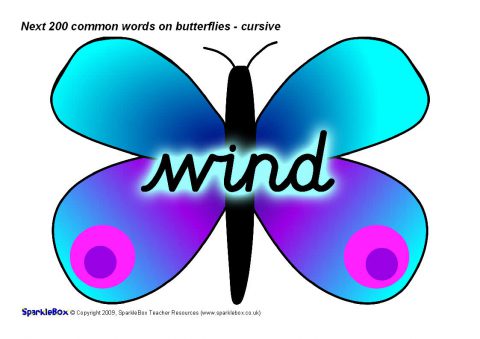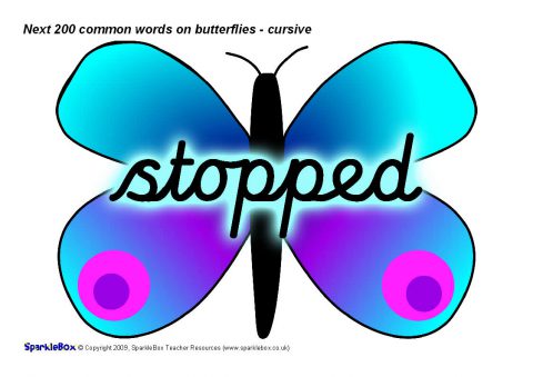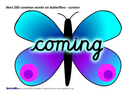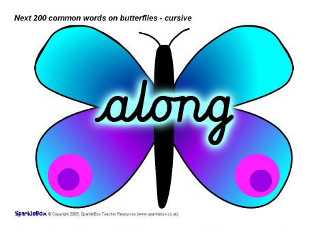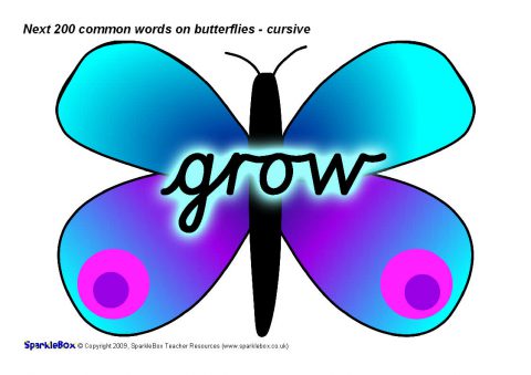 The next 200 common words as specified in the DfES ‘Letters and Sounds’ publication presented on colourful butterflies in cursive script. Great for classroom keyword displays linked to a minibeast-theme or as large flash cards.