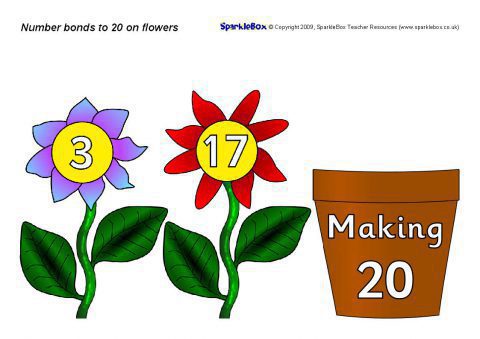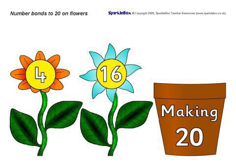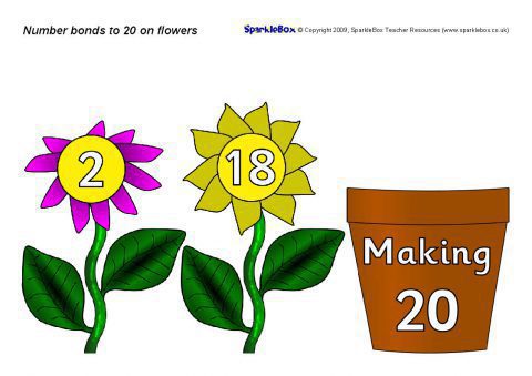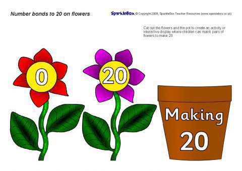 Printable flowers with number bonds to 20 and flower pot. Use to create interactive displays or for classroom activities where pupils pair the flowers to make 20.
