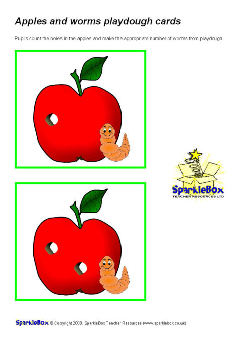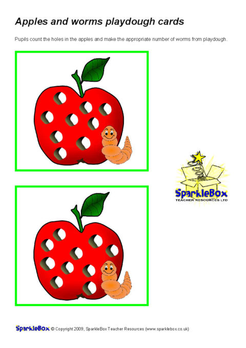 A set of printable cards showing apples with different numbers of holes made by worms.  Children count the holes and make the corresponding number of worms from playdough.