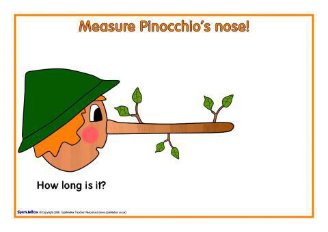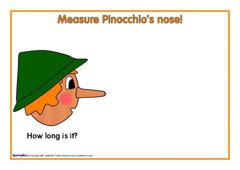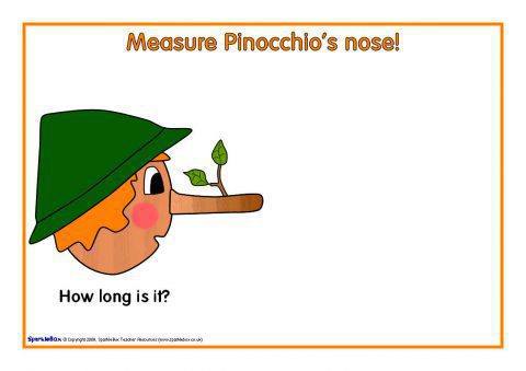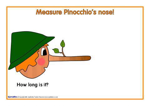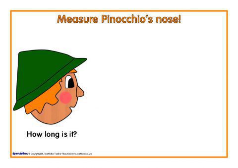 A set of sheets showing Pinocchio with different length noses. These can be measured with rulers or non-standard measures such as cubes or paper clips.