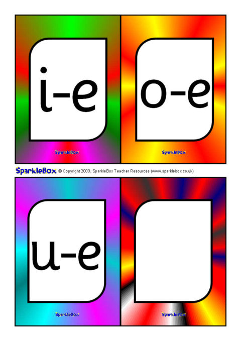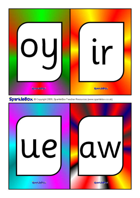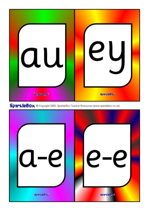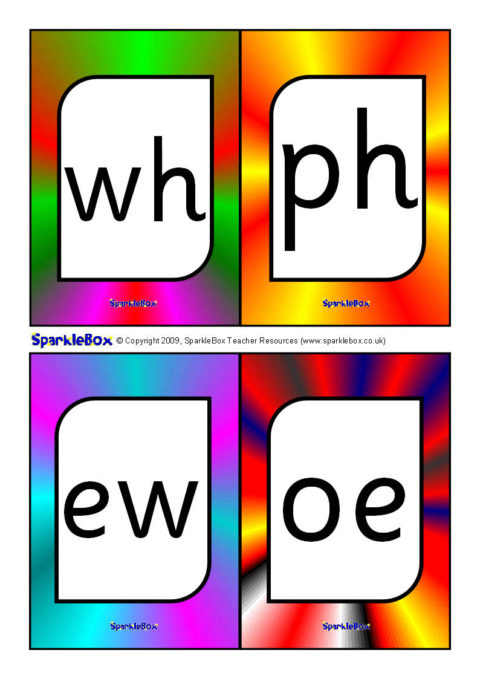 A useful set of brightly-coloured printable cards (4-to-a-page) with the additional Phase 5 phonemes specified in the DfES ‘Letters and Sounds’ publication.