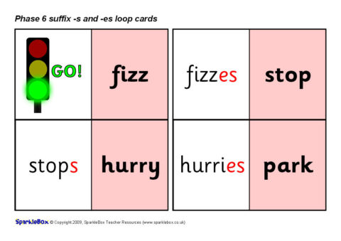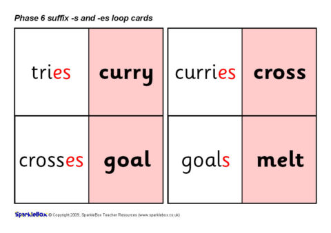 A set of printable loop cards featuring the example words with -s and -es suffixes, as listed in the DfES ‘Letters and Sounds’ publication.