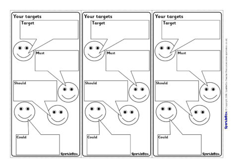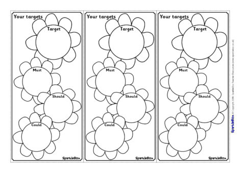 A set of editable black and white target sheets to give to pupils.  Includes space for the main targets and ‘must’, ‘should’ and ‘could’ objectives.