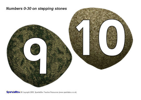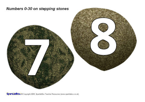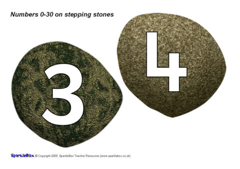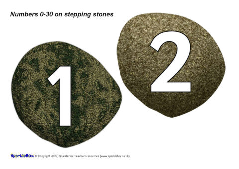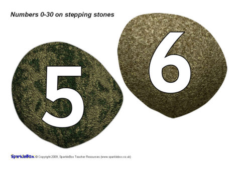 The numbers 0-30 presented on stepping stones.  Great for number ordering activities where children could place the stones across a ‘stream’ in the correct order.