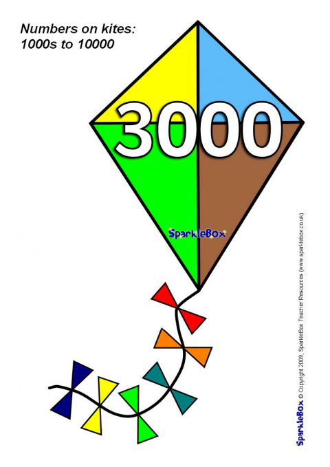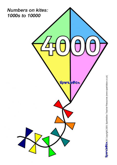 A set of printable kites (A4 size) with numbers in 1000s to 10000.