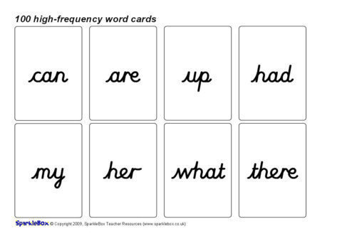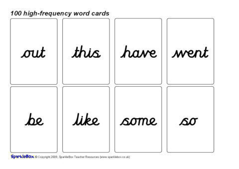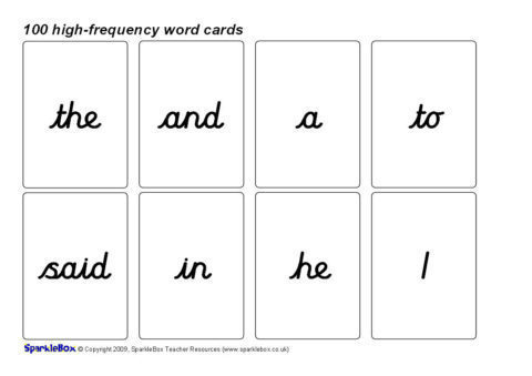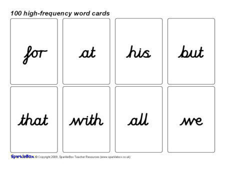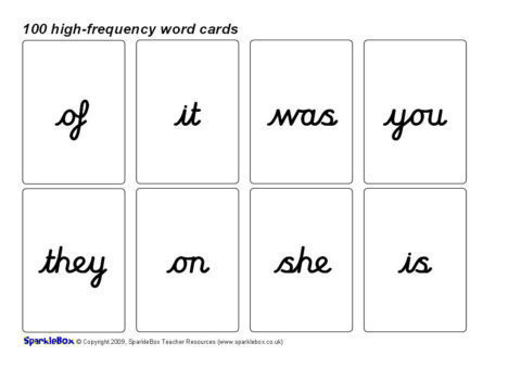The 100 high-frequency words as specified in the DfES ‘Letters and Sounds’ publication, in cursive handwriting, presented on simple flash cards.