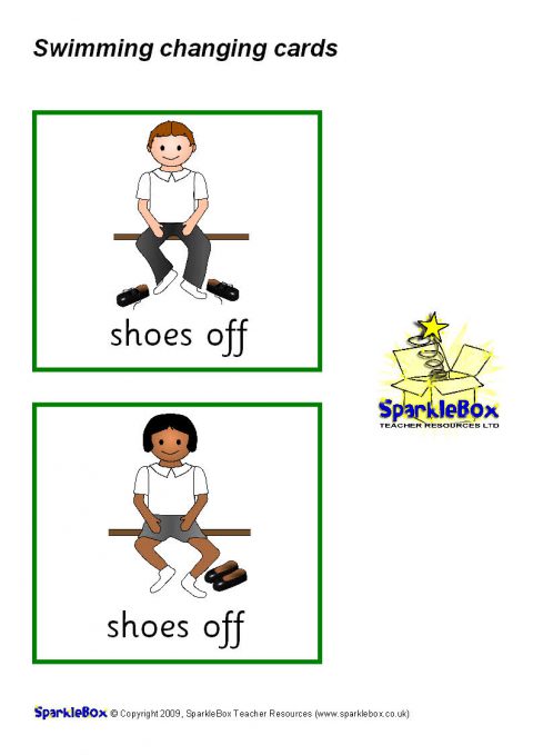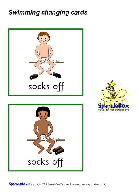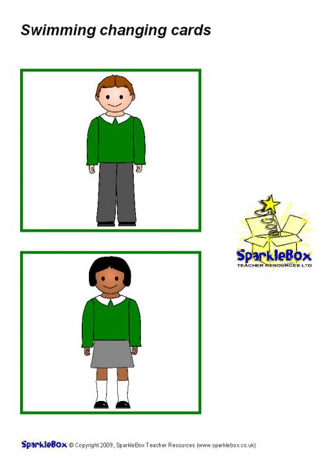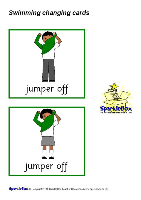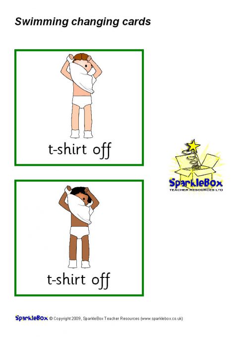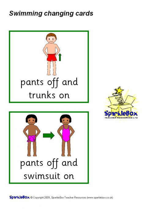 A set of cards to show the steps of getting changed into and out of swimming clothes. Includes both boy and girl cards. Green cards show steps for getting into swimming clothes, and red cards show steps for getting changed back. Ideal for use with children who have difficulty changing independently.