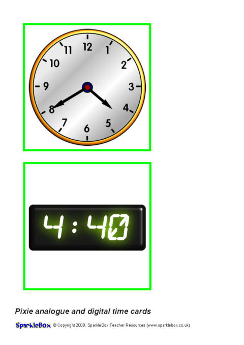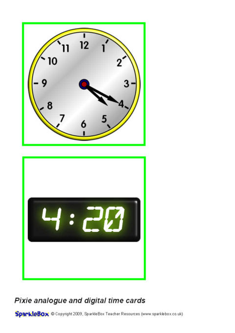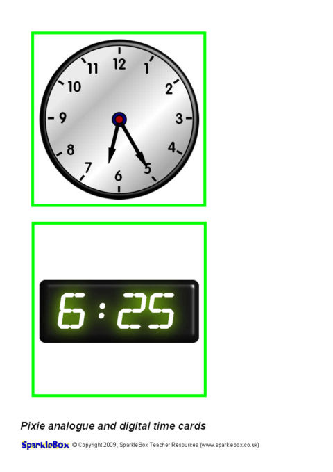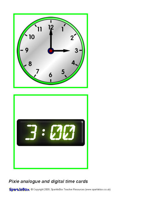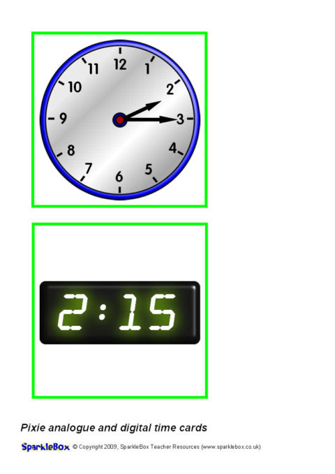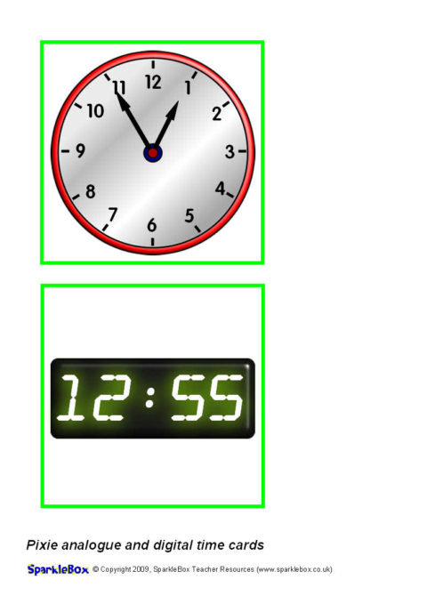 A set of printable cards with analogue and digital times (at 5 minutes), each sized 11cm x 11cm for use with a Pixie programmable robot.