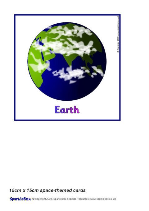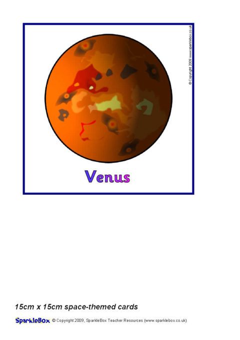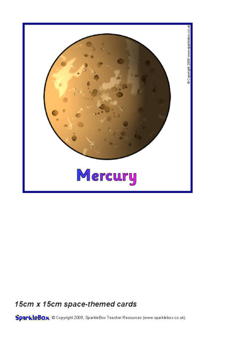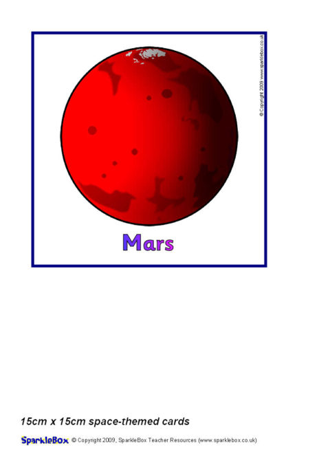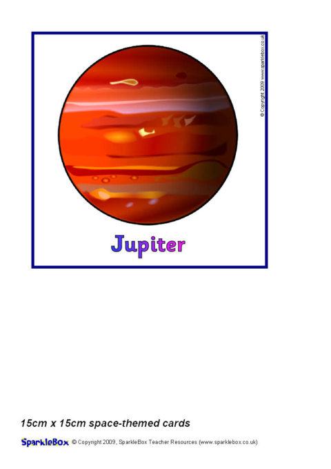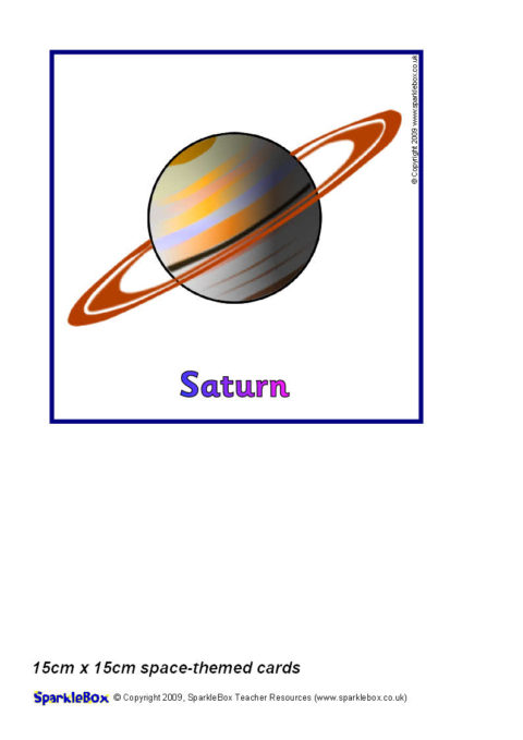 A set of printable cards (15cm by 15cm size) featuring the planets of the solar system and other features of space.